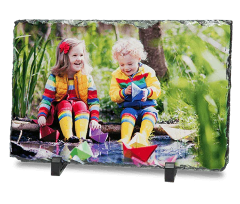 Transform cherished memories into stunning stone displays with photo slate printing. Ideal for home décor, gifts, or awards, these natural slates are coated and sublimated with vibrant, permanent images. The unique stone texture adds elegance and depth, making each piece one-of-a-kind. Available in various shapes and sizes, our photo slates come with stands for easy display. Classic Sublimation captures your special moments in a timeless and artistic format that’s built to last.